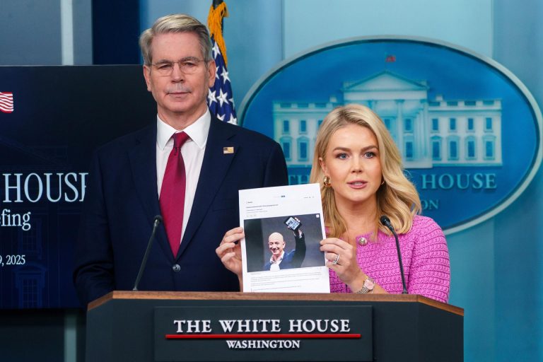 A secretária de imprensa da Casa Branca, Karoline Leavitt, exibe uma foto do dono da Amazon, Jeff Bezos, enquanto faz críticas à big tech em coletiva nesta terça-feira (29) (Foto: EFE/EPA/WILL OLIVER)