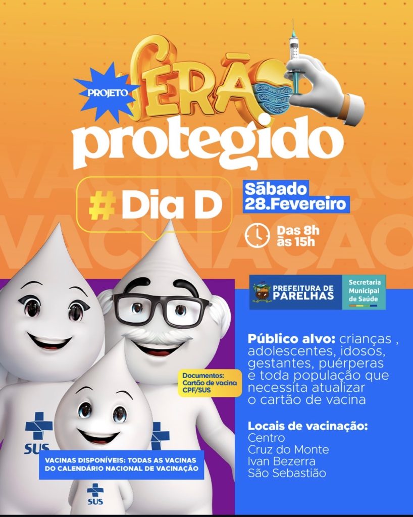 A Parelhas realizará mais uma importante ação de saúde pública com o Projeto Verão Protegido – Dia D de Vacinação. A mobilização acontecerá no dia 28 de fevereiro, das 08h às 15h, com o objetivo de atualizar a caderneta de vacinação da população e reforçar a proteção contra diversas doenças. A iniciativa é voltada para […]