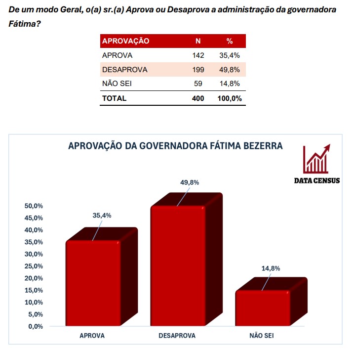 Uma pesquisa realizada pela DataCensus em 22 de julho de 2025 apontou que a governadora Fátima Bezerra enfrenta altos índices de desaprovação no município de Parelhas. Segundo o levantamento, 49,8% dos entrevistados desaprovam sua gestão, enquanto 35,4% aprovam. Já 14,8% não souberam ou não quiseram opinar. A pesquisa foi realizada com 400 eleitores. O estudo […]
