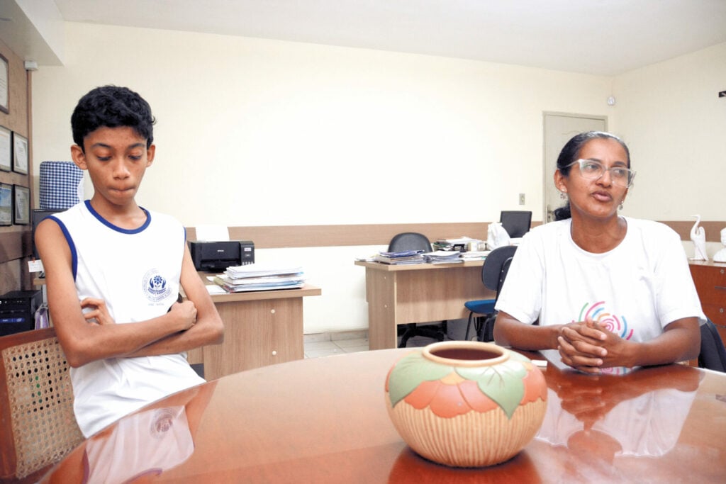 Na Escola Estadual Graciliano Lordão, Lucas Davi, 12, está no 7º ano do ensino fundamental e tem o acompanhamento de um professor auxiliar. A mãe, Eliane do Nascimento, 46, diz que a presença do profissional foi essencial para o desenvolvimento do filho. “Ele aprendeu, mas sempre precisou de auxiliar. No ano passado não teve nenhum, mas hoje tem e faz toda a diferença. Ele faz atividades, participa. A professora adapta as tarefas e ele consegue acompanhar no tempo dele”, afirma.
