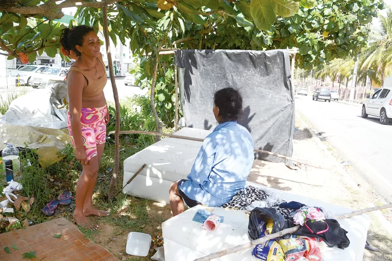 Uma das pessoas instaladas no local é Kathya Janine, 25 anos. Ela está acampada no ponto com quatro filhos e um irmão, todos menores de idade. Desde 2021, Kathya é moradora da Ocupação Valdete Guerra, no bairro Planalto. “Fui pra lá – ocupação – porque não tenho como pagar aluguel. Eu não vou mentir, tenho 5 filhos e realmente não tenho condições, por isso fico aqui – na Avenida das Alagoas – todo final de ano”, compartilha.