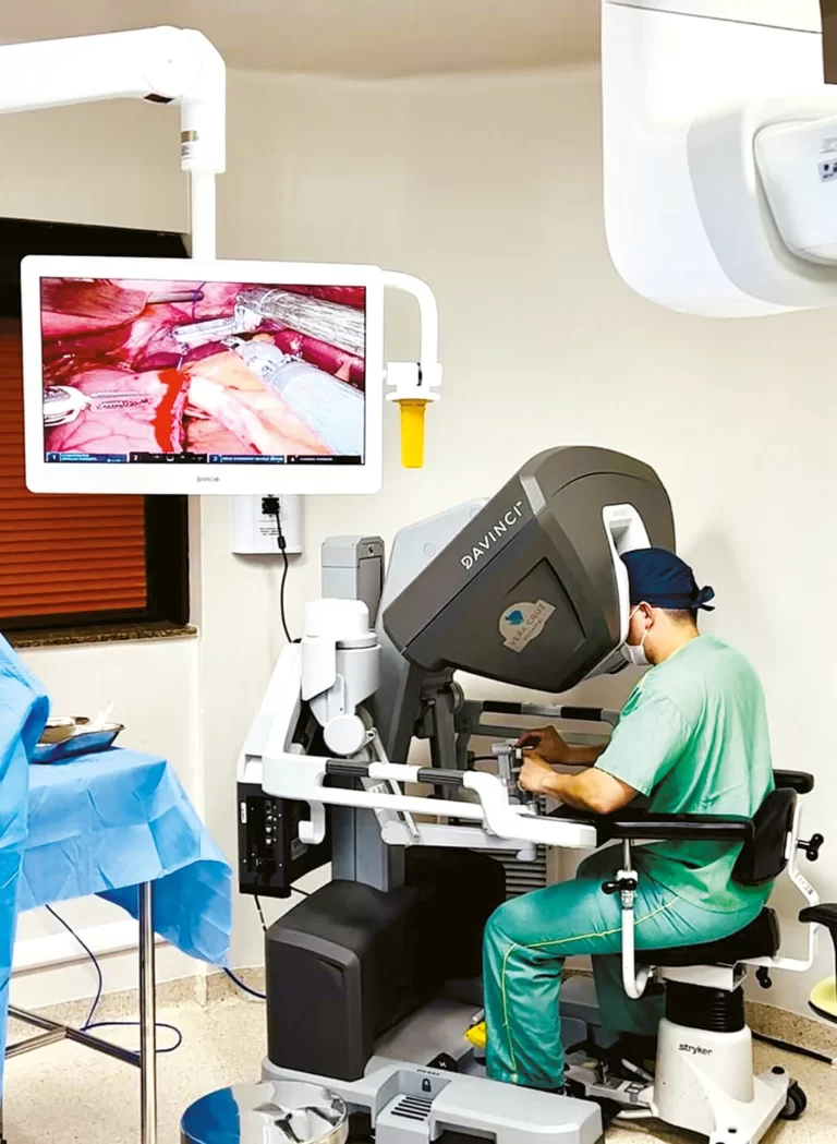 Tiago Diniz é cirurgião do aparelho digestivo e destaca que o robô facilita procedimentos bariátricos, permitindo operar com mais segurança pacientes com obesidade mais grave. “Na cirurgia bariátrica, conseguimos trabalhar de forma mais eficiente em pacientes de 200 ou 300 quilos, tornando o procedimento mais preciso e seguro”, afirma.