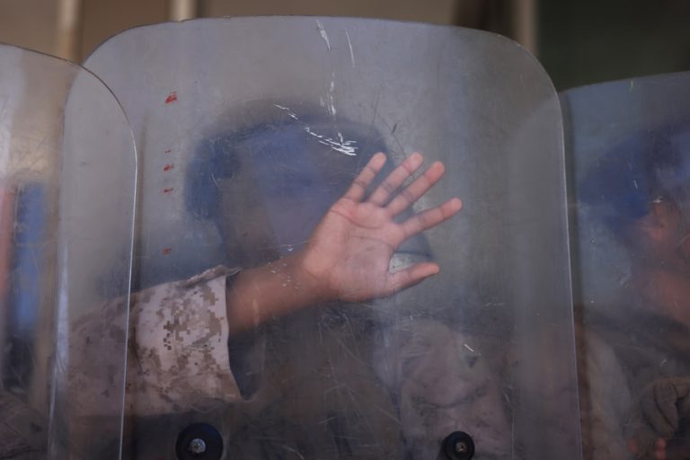 Uma declaração juramentada obtida pelo periódico Ojai Valley News aponta que “dezenas de manifestantes tentaram obstruir a execução do mandado de busca de alto risco”. Caravello teria “corrido até a granada, pegado-a e a lançado de volta, por cima da cabeça, em direção aos agentes da patrulha de fronteira”. A granada teria passado a poucos metros acima das cabeças dos policiais.